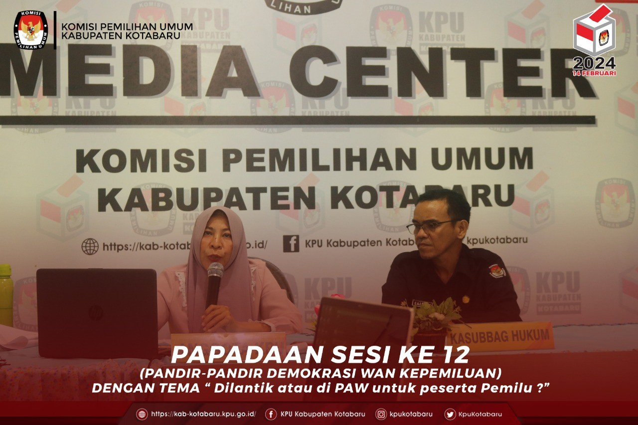 Rabu, 6 Juli 2022, Divisi Hukum dan Pengawasan KPU Kabupaten Kotabaru mengikuti kegiatan Forum Diskusi PAPADAAN (Pandir-Pandir Demokrasi Wan Kepemiluan) sesi ke-12 yang dilaksanakan oleh Divisi Hukum dan Pengawasan KPU Provinsi Kalimantan Selatan bersama Divisi Hukum KPU Kabupaten/Kota Se Kalimantan Selatan secara daring.  Dihadiri oleh Ketua Divisi Hukum dan Pengawasan KPU Provinsi Kalimantan Selatan Nur Zazin, Ketua Divisi Teknis Penyelenggaraan KPU Provinsi Kalimantan Selatan Hatmiati yang sekaligus menjadi Pengantar dalam Forum Diskusi dan dihadiri secara daring oleh Divisi Hukum dan Pengawasan serta Kasubbag/Staf KPU Kabupaten/Kota Se Kalimantan Selatan.  PAPADAAN kali ini mengangkat tema “Dilantik atau di PAW untuk Peserta Pemilu?”. Dinarasumberi oleh Ketua KPU Kabupaten Kotabaru Zainal Abidin, Ketua Divisi Hukum dan Pengawasan KPU Kabupaten Kotabaru Jumanti Liany, serta dimoderatori Kasubbag Hukum dan SDM KPU Kabupaten Kotabaru Sairaji.   Kegiatan Forum Diskusi PAPADAAN dimaksudkan guna meningkatkan pengetahuan dan wawasan tentang hukum kepemiluan, transformasi pengalaman hukum kepemiluan di masing-masing Kabupaten/Kota, persiapan dan penguatan pemahaman hukum dalam tahapan pemilu, dan menjaga profesionalitas dan integritas SDM di bidang hukum. #kpukabupatenkotabaru #kpumelayani