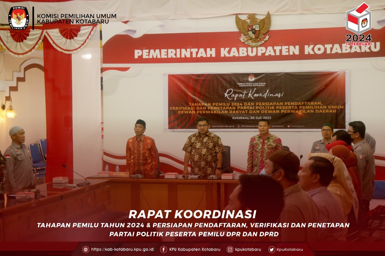 Sabtu (30/7/2022) KPU Kabupaten Kotabaru menyelenggarakan Rapat Koordinasi Tahapan Pemilu Tahun 2024 dan Persiapan Pendaftaran, Verifikasi dan Penetapan Partai politik Peserta Pemilihan Umum Dewan Perwakilan Rakyat dan Dewan Perwakilan Rakyat Daerah. Ketua KPU Provinsi Kalimantan Selatan, Sarmuji pada sambutannya menyampaikan Tahapan dan Jadwal Pendaftaran, Verifikasi dan Penetapan Partai Politik dalam Penyelenggaraan Pemilu Tahun 2024 kepada Partai Politik di Kabupaten Kotabaru yang berhadir pada kegiatan tersebut. Rapat Koordinasi ini dihadiri oleh Bawaslu Kab.Kotabaru, Polres Kotabaru, Kodim 1004 Kotabaru, Lanal Kab.Kotabaru, serta Partai Politik yang dilaksanakan di Operation Room Kabupaten Kotabaru. #pemiluserentak2024 #integritas24jam #kpukabupatenkotabaru #kpumelayani