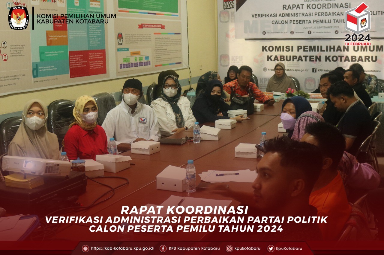 Jum'at (23/9/2022) KPU Kabupaten Kotabaru menyelenggarakan Rapat Koordinasi Verifikasi Administrasi Perbaikan Partai Politik Calon Peserta Pemilu Tahun 2024. Kegiatan ini dibuka oleh Anggota KPU Divisi Teknis Penyelenggaraan, Ibu Grace Y. Lengkey, SE dan selaku narasumber pada kegiatan tersebut yakni Ketua KPU Provinsi kalimantan Selatan, Bapak Sarmuji, M.Ag melalui media daring.  Dalam kegiatan ini dilakukan diskusi dan tanya jawab terkait Tahapan Verifikasi Administrasi Perbaikan Partai Politik Calon Peserta Pemilu Tahun 2024. Rapat Koordinasi ini dihadiri oleh Bawaslu Kab.Kotabaru, serta tentunya perwakilan dari Partai Politik yang ada di Kotabaru. Kegiatan ini juga dihadiri oleh Sekretaris KPU Kab. Kotabaru, M. Sadikin Noor, S.Ap beserta jajaran Sekretariat. #pemiluserentak2024 #integritas24jam #kpukabupatenkotabaru #kpumelayani
