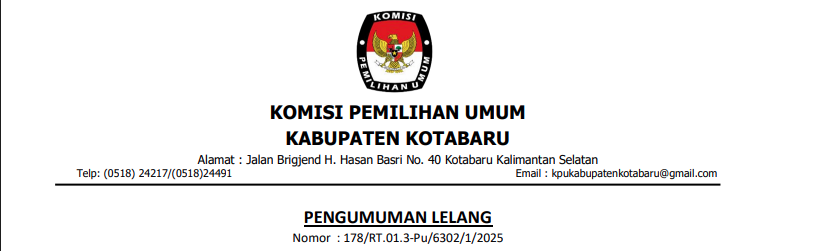 Berdasarkan Pengumuman Lelang Komisi Pemilihan Umum Kabupaten Kotabaru Nomor : 178/RT.01.3-Pu/6302/1/2025 Kantor Komisi Pemilihan Umum Kabupaten Kotabaru berdasarkan persetujuan penghapusan dari Sekretaris Jenderal KPU RI Nomor : 2562/RT.01.3-SD/05/2025 tanggal 29 Juli 2025 perihal Persetujuan Penjualan Barang Persediaan Pasca Pemilihan Umum dan Pemilihan Tahun 2024 melalui KPKNL Banjarmasin akan melaksanakan lelang Non eksekusi Wajib Barang Milik Negara (BMN). Lelang dilaksanakan dengan penawaran Open Bidding dengan akses ke alamat domain lelang.go.id