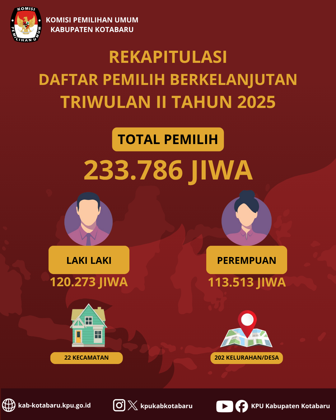 Rapat pleno terbuka Rekapitulasi Pemutakhiran Data Pemilih Berkelanjutan Tingkat Kabupaten Kotabaru Triwulan II Tahun 2025 digelar sebagai bagian dari siklus pemutakhiran data pemilih yang rutin dilaksanakan KPU. Kegiatan yang berlangsung di ruang Media Center KPU Kabupaten Kotabaru ini dihadiri oleh Ketua dan Anggota Bawaslu Kabupaten Kotabaru, perwakilan Badan Kesatuan Bangsa dan Politik, perwakilan Dinas Kependudukan dan Catatan Sipil serta perwakilan dari Polres Kotabaru dan Kodim 1004 Kotabaru.