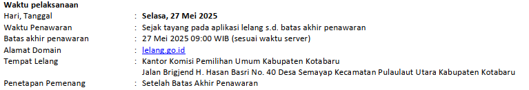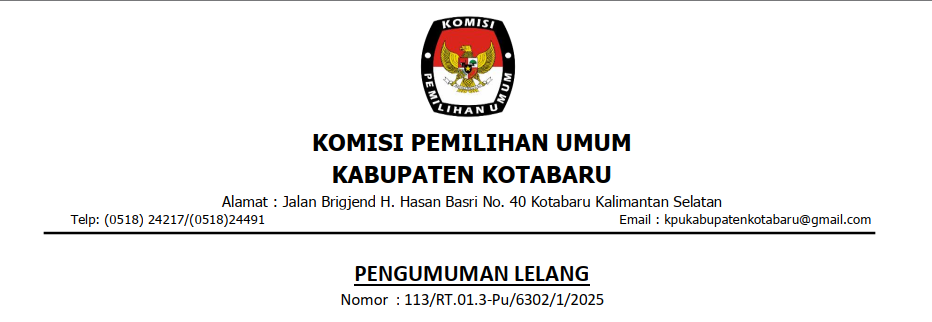 Berdasarkan Pengumuman Lelang Komisi Pemilihan Umum Kabupetn Kotabaru Nomor : 113/RT.01.3-Pu/6302/1/2025 Kantor Komisi Pemilihan Umum Kabupaten Kotabaru berdasarkan persetujuan penghapusan dari Sekretaris Jenderal KPU RI Nomor : 560/RT.01.3-SD/05/2025 tanggal 17 Februari 2025 perihal Persetujuan Penjualan Barang Persediaan Pasca Pemilihan Umum Tahun 2024 melalui KPKNL Banjarmasin akan melaksanakan lelang Non eksekusi Wajib Barang Milik Negara (BMN). Lelang dilaksanakan dengan penawaran Open Bidding dengan akses ke alamat domain lelang.go.id