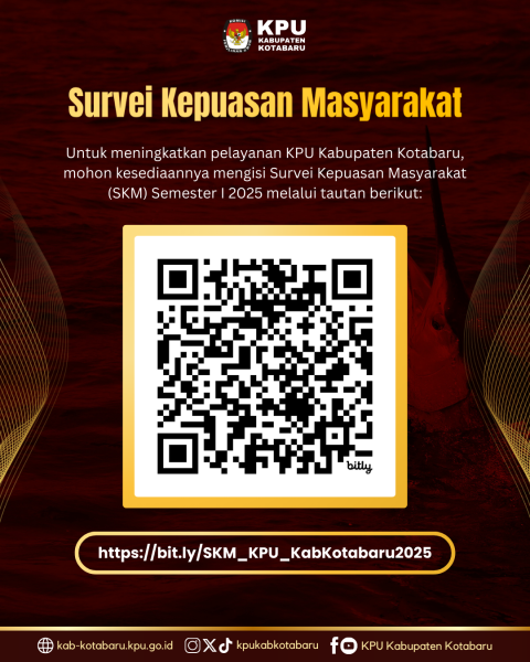 Untuk meningkatkan pelayanan KPU Kabupaten Kotabaru, mohon kesediaannya mengisi Survei Kepuasan Masyarakat (SKM) Semester I 2025 melalui tautan berikut: https://bit.ly/SKM_KPU_KabKotabaru2025