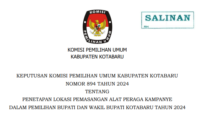 Keputusan Komisi Pemilihan Umum Kabupaten Kotabaru Nomor 894 Tahun 2024 Tentang Penetapan Lokasi Pemasanagan Alat Peraga Kampanye Dalam Pemilihahn Bupati Dan Wakil Bupati Kotabaru Tahun 2024, lampiran download disini