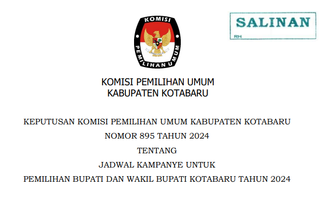 Keputusan Komisi Pemilihan Umum Kabupaten Kotabaru Nomor 895 Tahun 2024 Tentang Jadwal Kampanye Untuk Pemilihan Bupati Dan Wakil Bupati Kotabaru Tahun 2024, lampiran download disini