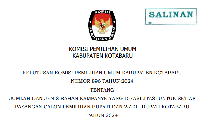 Keputusan Komisi Pemilihan Umum Kabupaten Kotabaru Nomor 896 Tahun 2024 Tentang Jumlah Dan Jenis Bahan Kampanye Yang Difasilitasi Untuk Setiap Pasangan Calon Pemilihan Bupati Dan Wakil Bupati Kotabaru Tahun 2024, lampiran download disini