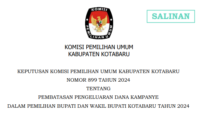 Keputusan Komisi Pemilihan Umum Kabupaten Kotabaru Nomor 899 Tahun 2024 Tentang Pembatasan Pengeluaran Dana Kampanye Dalam Pemilihan Bupati Dan Wakil Bupati Kotabaru Tahun 2024, lampiran download disini