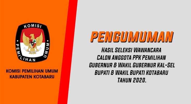 KPU Kabupaten Kotabaru telah melaksanakan seleksi tertulis terhadap calon anggota Panitia Pemilihan Kecamatan (PPK) di Media Center KPU Kabupaten Kotabaru pada Pemilihan Gubernur & Wakil Gubernur Kalimantan Selatan serta Bupati & Wakil Bupati Kotabaru Tahun 2020. Seleksi tertulis tersebut dilaksanakan pada Minggu, 2 Februari 2020 lalu. Selanjutnya, kepada peserta yang telah dinyatakan lulus seleksi tertulis agar dapat mengikuti seleksi wawancara yang akan dilaksanakan pada tanggal 9 - 11 Februari 2020. Jadwal selengkapnya terdapat pada berkas pengumuman. Wawancara akan dilaksanakan di Kantor KPU Kab. Kotabaru dan Hotel Gellery Kotabaru” pengumuman selengkapnya dapat diunduh melalui tautan berikut: