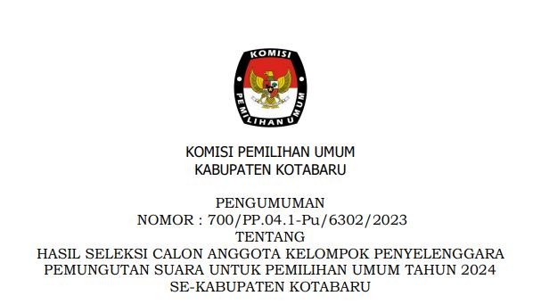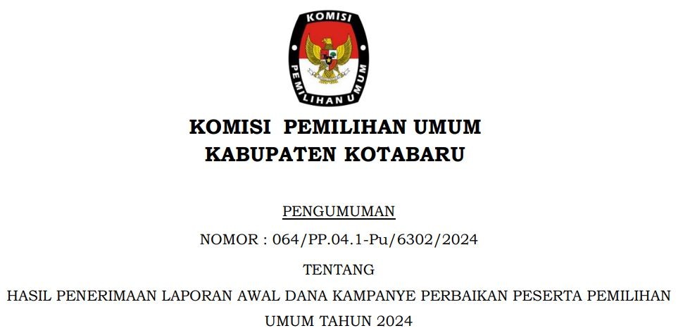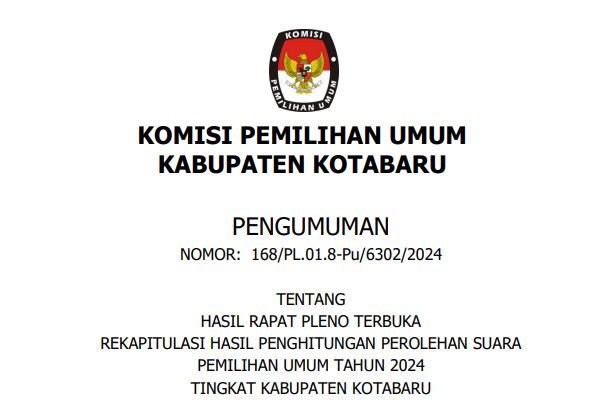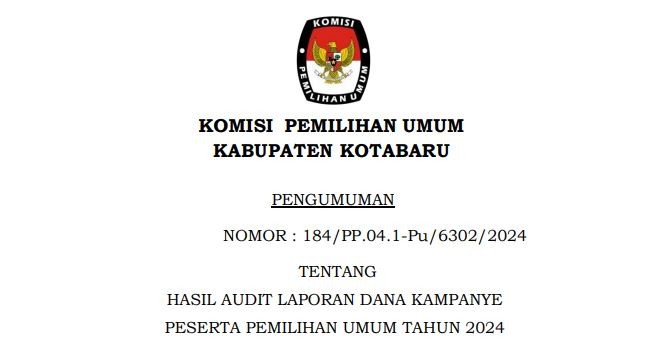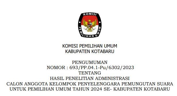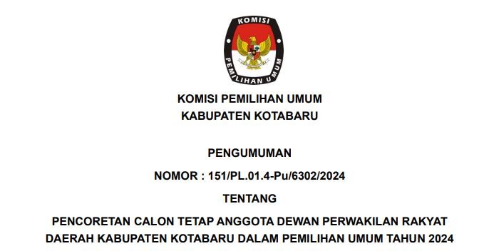 Sehubungan dengan telah dilakukan Perubahan Keputusan KPU Kabupaten Kotabaru tentang Daftar Calon Tetap Anggota Dewan Perwakilan Rakyat Daerah Kabupaten Kotabaru dalam Pemilihan Umum Tahun 2024, diumumkan nama-nama calon tetap sebagaimana tersebut dibawah ini telah dicoret dan dinyatakan tidak memenuhi syarat, Lampiran download disini