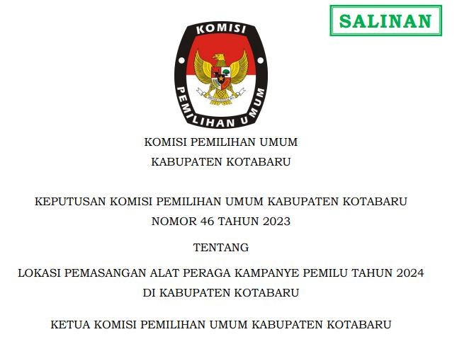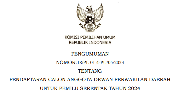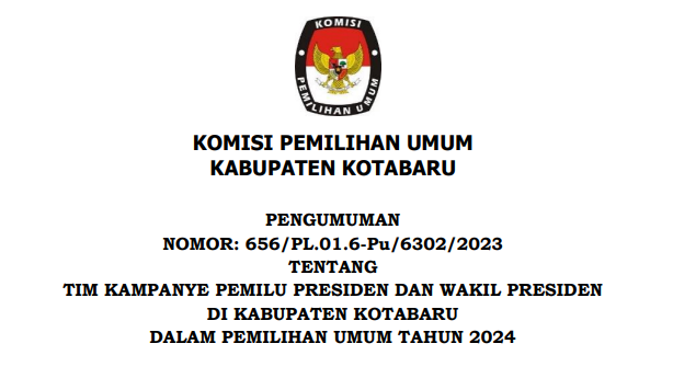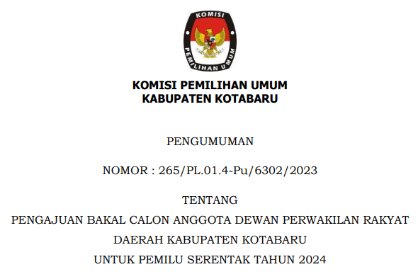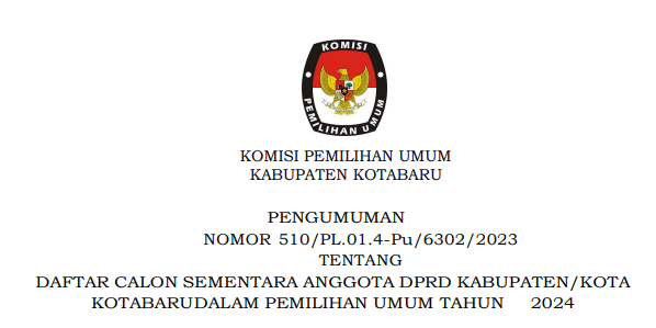 Bahwa untuk melaksanakan ketentuan Pasal 70 Peraturan KPU Nomor 10 Tahun 2023 tentang Pencalonan Anggota Dewan Perwakilan Rakyat, Dewan Perwakilan Rakyat Daerah Provinsi, dan Dewan Perwakilan Rakyat Daerah Kabupaten/Kota, KPU Kabupaten/Kota KOTABARU mengumumkan Daftar Calon Sementara (DCS) Anggota DPRD Kabupaten/Kota KOTABARU dan persentase keterwakilan perempuan dalam Daftar Calon Sementara (DCS) sebagaimana terlampir.