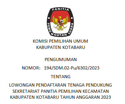 Berikut disampaikan pengumuman Lowongan Pendaftaran Tenaga Pendukung Sekretariat Panitia Pemilihan Kecamatan Kabupaten Kotabaru Tahun Anggaran 2023