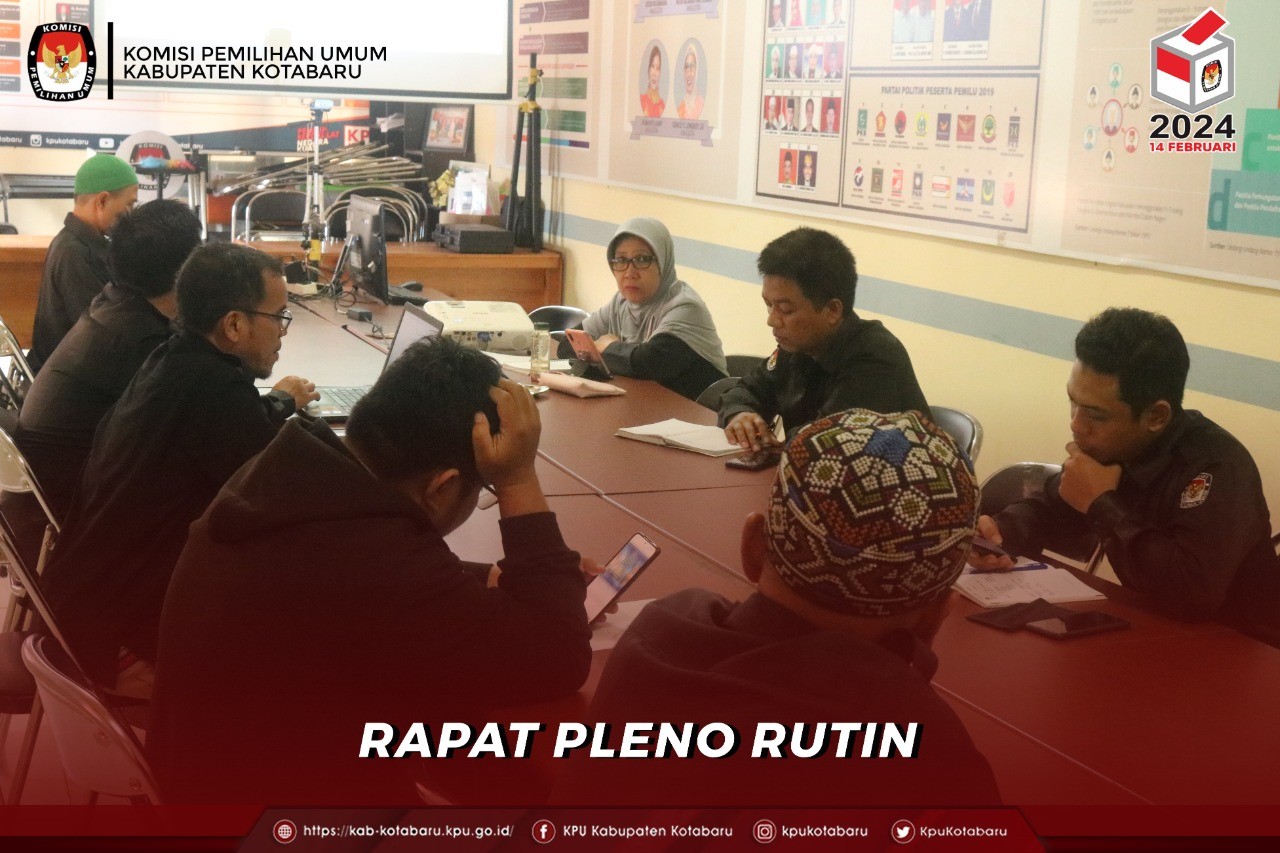KPU Kabupaten Kotabaru kembali melaksanakan kegiatan Rapat pleno rutin mingguan, Rabu (15/6). Tepat pukul 14.00, bertempat di Ruang Media Center. Rapat dipimpin langsung oleh Ketua KPU Kabupaten Kotabaru, Zainal abidin,S.Sos dan dihadiri seluruh Komisioner, Plt. Sekretaris, serta Kasubbag di jajaran Satker KPU Kabupaten Kotabaru.
